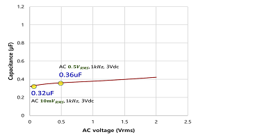 現(xiàn)在,如果在標(biāo)準(zhǔn)測量條件下將交流電水平從500 mV RMS降低至10 mV RMS,  同時保持相同的1kHz頻率和3V dc偏置,則有效電容將進一步降至0.32 μF,額外降低4%減少。但是,增加交流信號幅度會增加有效電容(圖2,即使只是微不足道。但是請注意,這并非普遍正確。