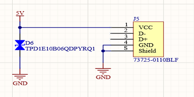 除了電源濾波之外,我還為每個輸入添加了一些基本的ESD保護。如果像許多貿易展覽會場館一樣跪在地毯上,準備好相機準備插入設備時會積聚靜電,這很容易導致ESD事件損壞相當昂貴的設備。通過在輸入端和穩(wěn)壓器板上提供ESD保護,我們應該為攝像機提供相當高的保護等級。我在主電源板上使用的5v線路使用的是相同的0402尺寸TVS二極管TI TPD1E10B06QDPYRQ1。這些雖然很小,但具有汽車認證資格,并且可能能夠在中高濕度條件下處理海平面上的ESD事件。