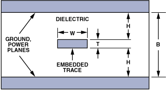 帶狀線控制阻抗線(見(jiàn)圖14)使用兩層地平面,信號(hào)線夾在它們之間。這種方法使用更多的通道,需要更多的板層,對(duì)介電厚度變化敏感,而且成本更高,因此通常只在要求苛刻的應(yīng)用中使用。