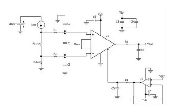 5通過RSHUNT測量差分電壓,R1、R2、C1、C2和C3用于提供共模和差模濾波,R3和C4為U1 INA提供輸出濾波,U2用于緩沖INA參考引腳. R4和C5用于形成一個低通濾波器,大限度地減少由運算放大器引入到INA參考引腳的噪聲。