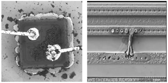 EOS故障(左圖)與單個(gè)晶體管的ESD故障(右圖)相比。請(qǐng)注意,ESD故障會(huì)在集電極和發(fā)射極區(qū)域之間造成短路。